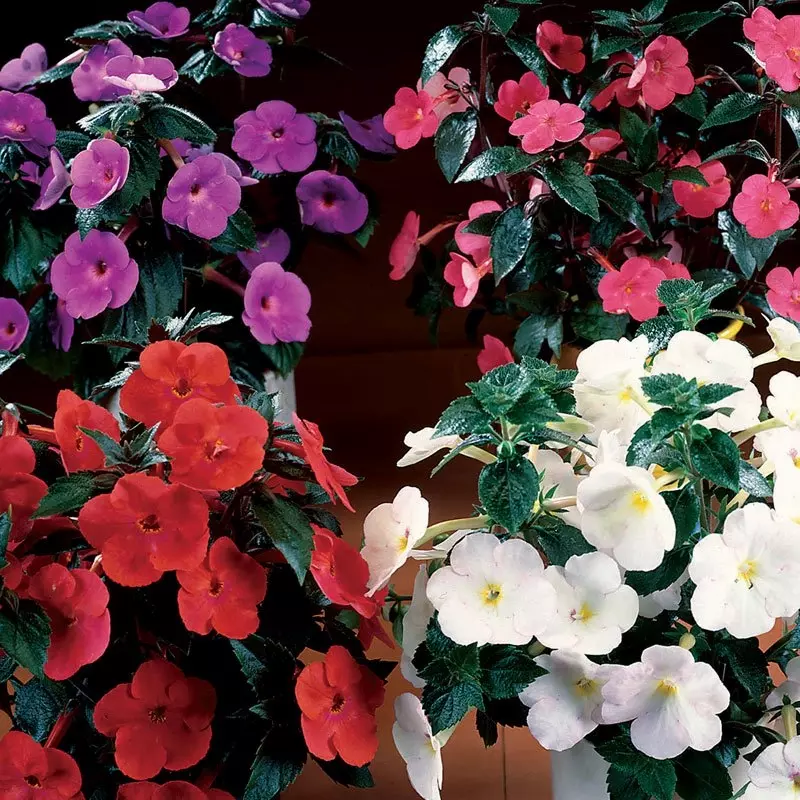 A profusion of open-faced blooms, resembling petunias crossed with violets, covers the mounded foliage which will cascade over the brim of your pots. This Achimenes 'Mixture' includes bold red-orange and purple varieties along with softer pinks and crisp whites.