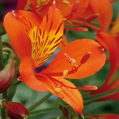 Bring a rush of fiery colour to summer and autumn borders with Alstroemeria ‘Aurea Orange King’.From June until October, this exotic-looking Peruvian lily bears clusters of glowing, funnel-shaped orange flowers with a golden-yellow upper lip and dark speckles.
