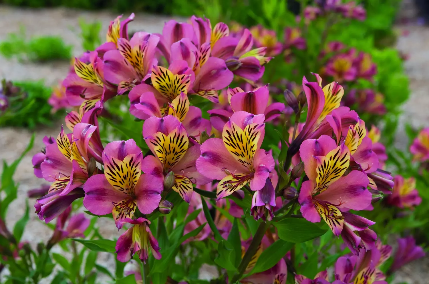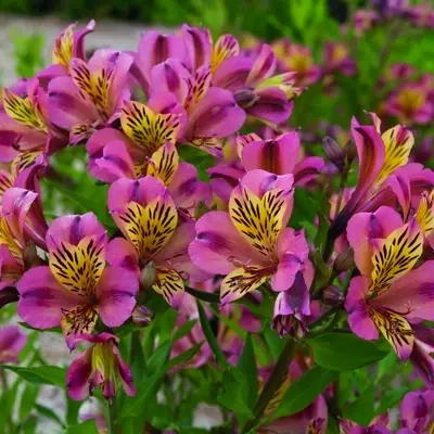 Decorative Dahlia 'Pinkie Swear' dazzles with large double blooms in shades of magenta, soft pink, and pure white. Each petal is delicately edged with a picotee outline, giving the flowers a playful yet refined charm.
