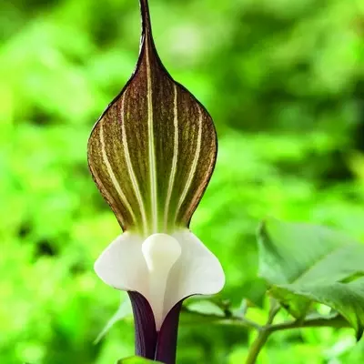Arisaema 'Sikokianum', one of the most iconic and instantly recognisable cobra lilies. This rare Japanese species produces one of the most striking flowers, a deep purple-black hood wrapped around a perfectly pure white, domed spadix. The contrast is unbelievable and instantly makes this plant a collector’s favourite.