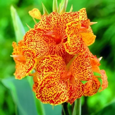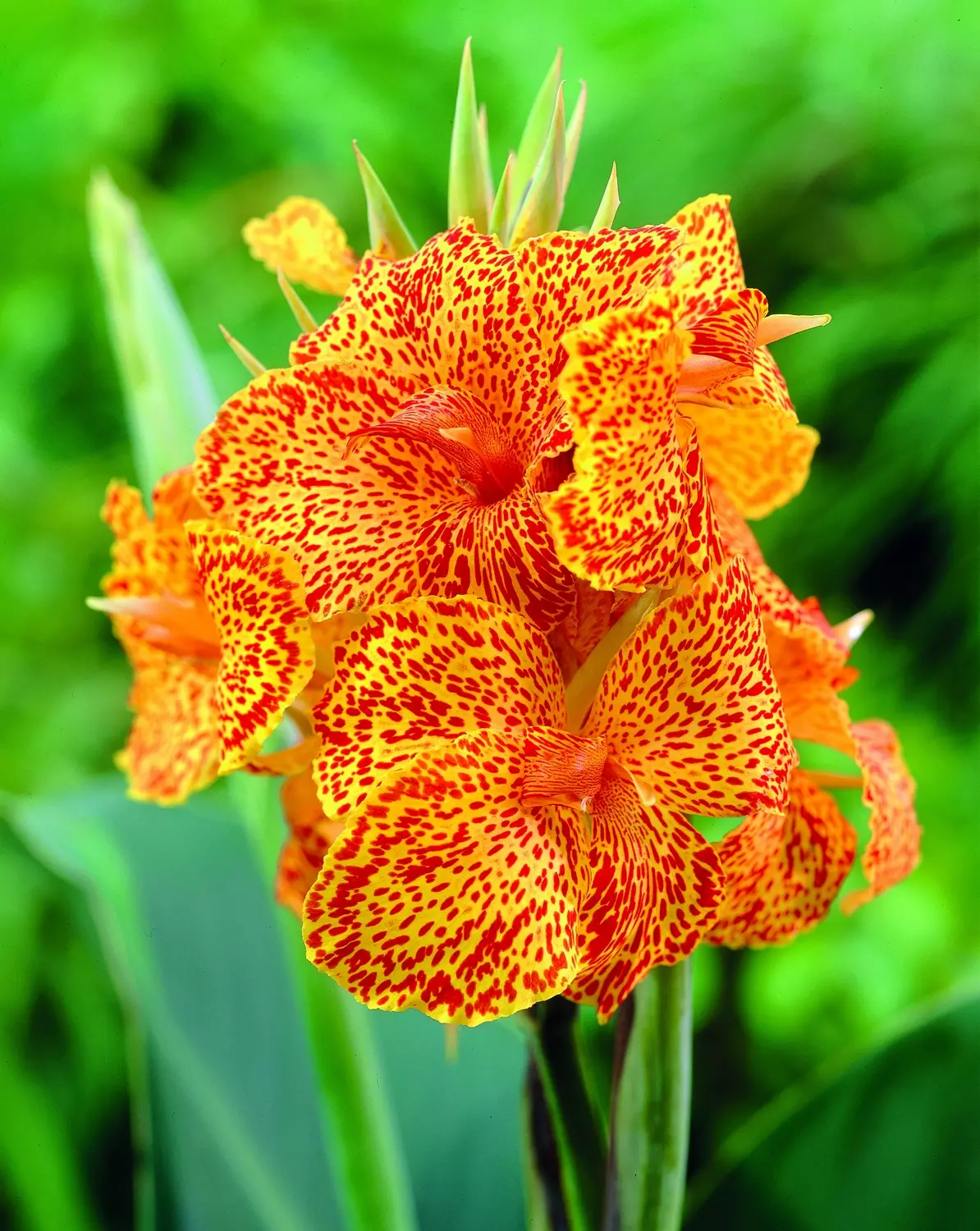Bright yellow flowers speckled with vivid red complement the striking blue-green foliage of Canna 'Picasso'.
