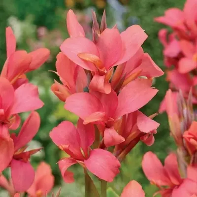 Boasting architectural foliage and flamboyant flowers, Canna ‘City of Portland’ is an exotic showstopper bursting with dramatic flair. Every aspect of this remarkable plant offers stunning ornamental interest – from the loose, ruffled waves of glowing coral-pink petals borne on soaring spires, to the enormous, lush green leaves tinted with burgundy.
