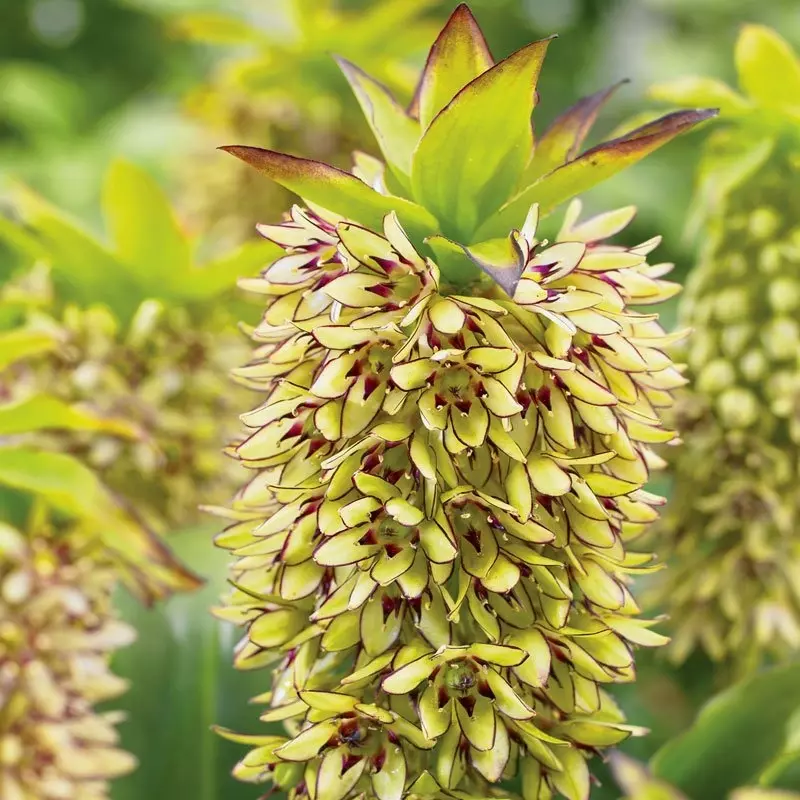 Eucomis 'Bicolor' stands out for its beautifully detailed flower spikes, where greenish-white starry blooms are each finely edged in deep purple. Awarded the RHS Award of Garden Merit for its consistent performance,