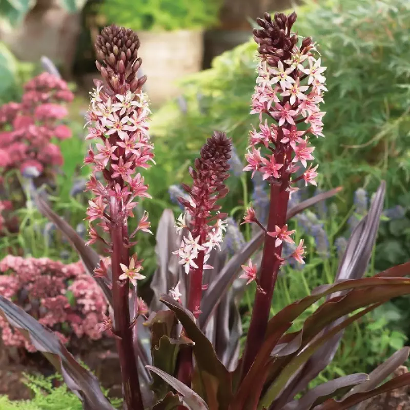Eucomis ‘Sparkling Burgundy’ is a true showstopper, prized for its striking deep reddish-purple foliage that intensifies as the summer progresses.