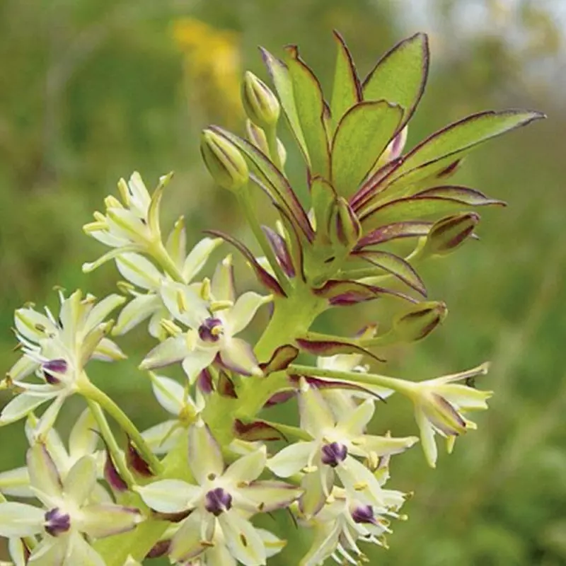 Alternatively referred to as the ‘Pineapple Flower’, Eucomis ‘Comosa’ will bring a dash of tropical charm to your garden. Each pearly white petal and lush green bract is outlined with a margin of contrasting maroon-purple, enhanced against a backdrop of wavy-edged, arching foliage.