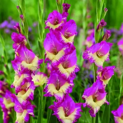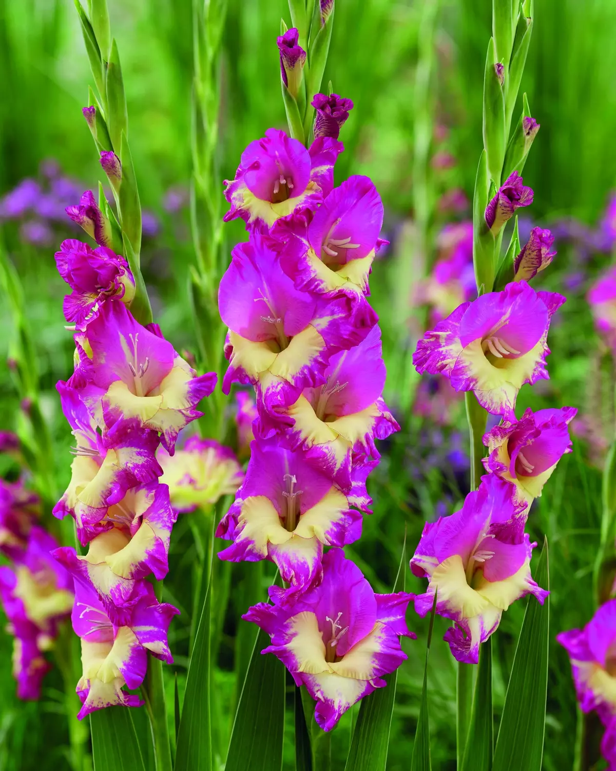 Turn your garden into a summer spectacle with Large Flowered Gladioli ‘Extravert’, a large-flowered variety boasting striking pink and magenta blooms with a yellow centre. Flowering from mid to late summer, offering long-lasting, tall elegant spikes growing up to between 90 - 120 cm.