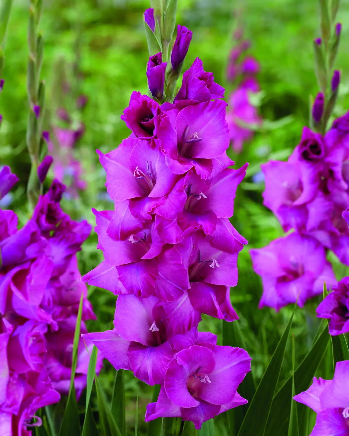 To cultivate Gladioli, choose a sunny site with well-drained, well-manured garden soil. Dig a trench 15cm deep and place the corms 10-15cm apart, covering with soil and ensuring they sit 5cm below the surface. Water regularly, maintaining soil moisture until growth is established, and during hot, dry spells of weather. Stagger planting at two-week intervals to ensure continuous flowering over a long period. Expect stately, colourful spikes reaching 60-90cm in height which many require staking for support. The smaller variety ‘Glamini’ Gladioli will reach a maximum height of 50cm.