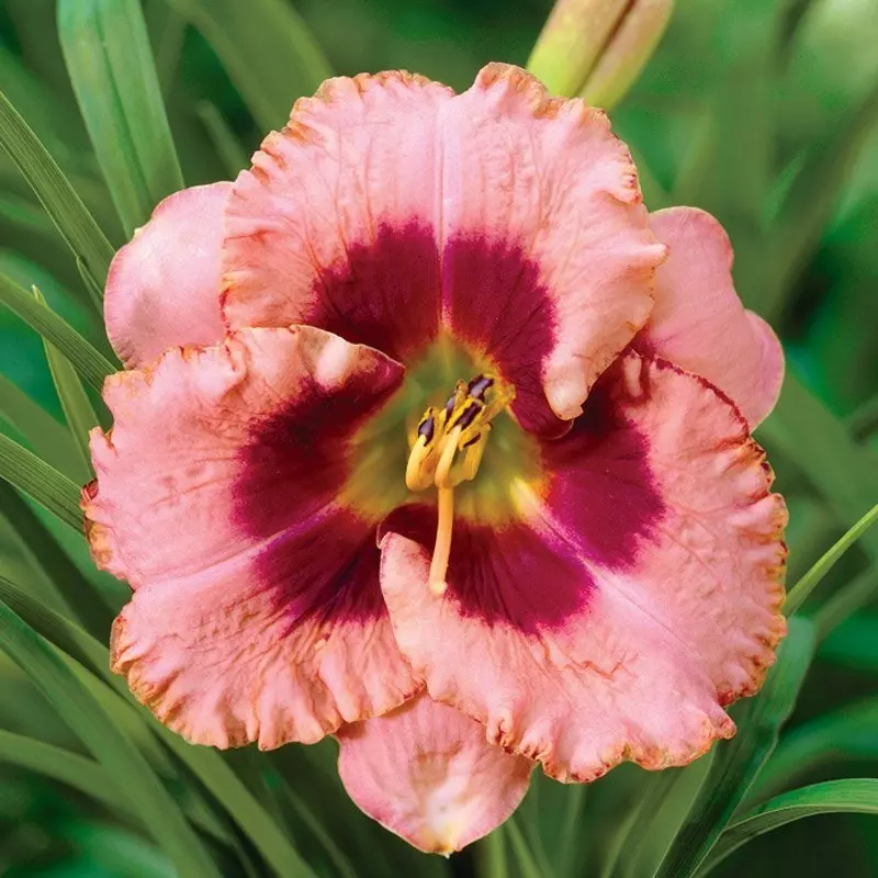 Hemerocallis ‘Daring Deception’ is a captivating Day Lily admired for its refined yet striking colour contrast. Each bloom features dusky-pink petals framed with gentle ruffling, with deep purple edges and a yellow throat, instantly memorable in the summer garden.