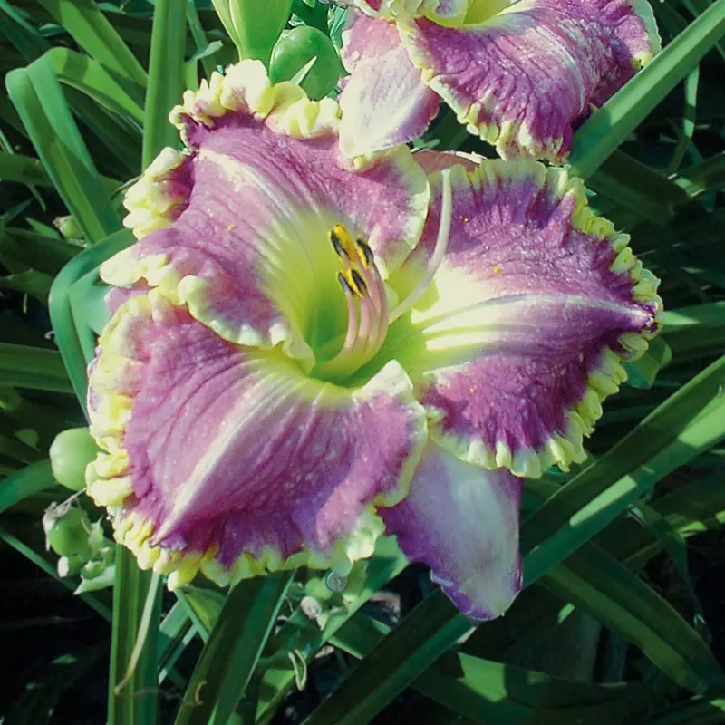 Violet-mauve blooms with creamy-yellow ruffled edges and a greenish centre distinguish Hemerocallis 'Best Seller'. Although each individual flower opens for only one day, the sheer number of buds ensures a steady succession of new blooms, filling the garden with vibrant colour for many weeks right through the summer.