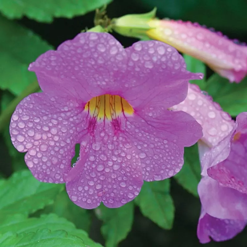 The exuberant flowers of Incarvillea ‘Delavayi’ are held in multi-headed clusters at the top of sturdy stems. Sizeable, mauve-pink petals flare outwards to reveal a golden heart.