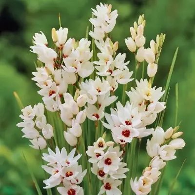 Also known as ‘wand flowers’, Ixia ‘Giant’ brings a magical touch with clusters of twinkling, starry, ivory-white flowers embellished with purple-maroon hearts. As its name suggests, this variety bears particularly sizeable blooms on tall stems.