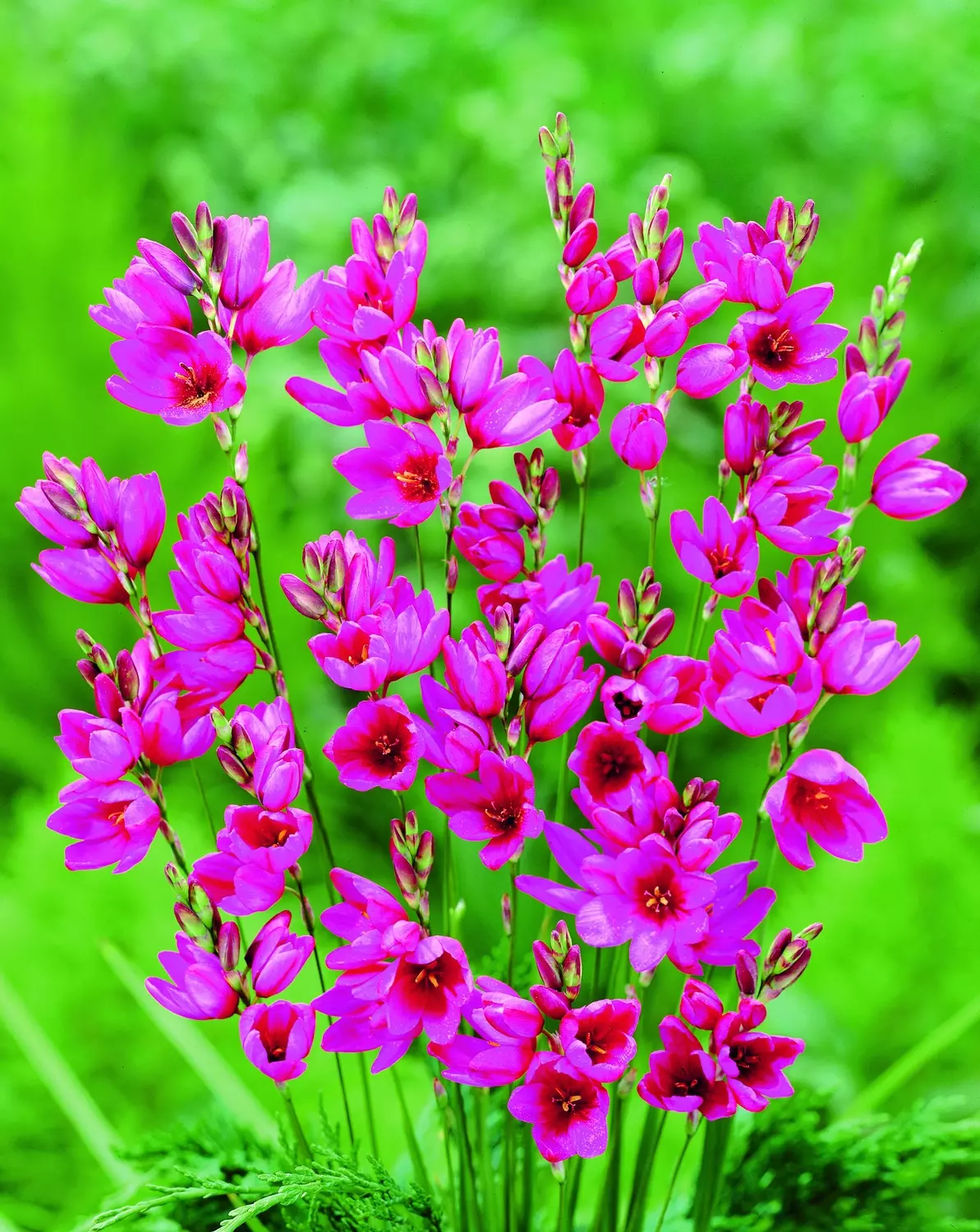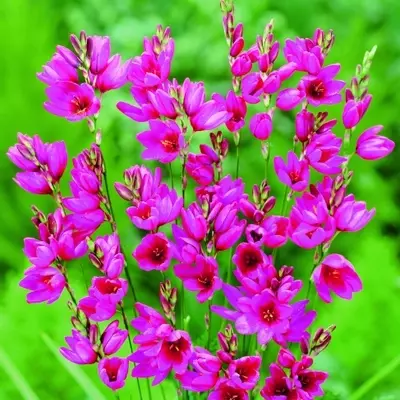 Ixia 'Mabel' dazzles with vibrant, deep pink blooms, evoking whimsical elegance in any garden. These striking flowers, with star-shaped petals, bloom profusely, creating a breathtaking tapestry of colour.