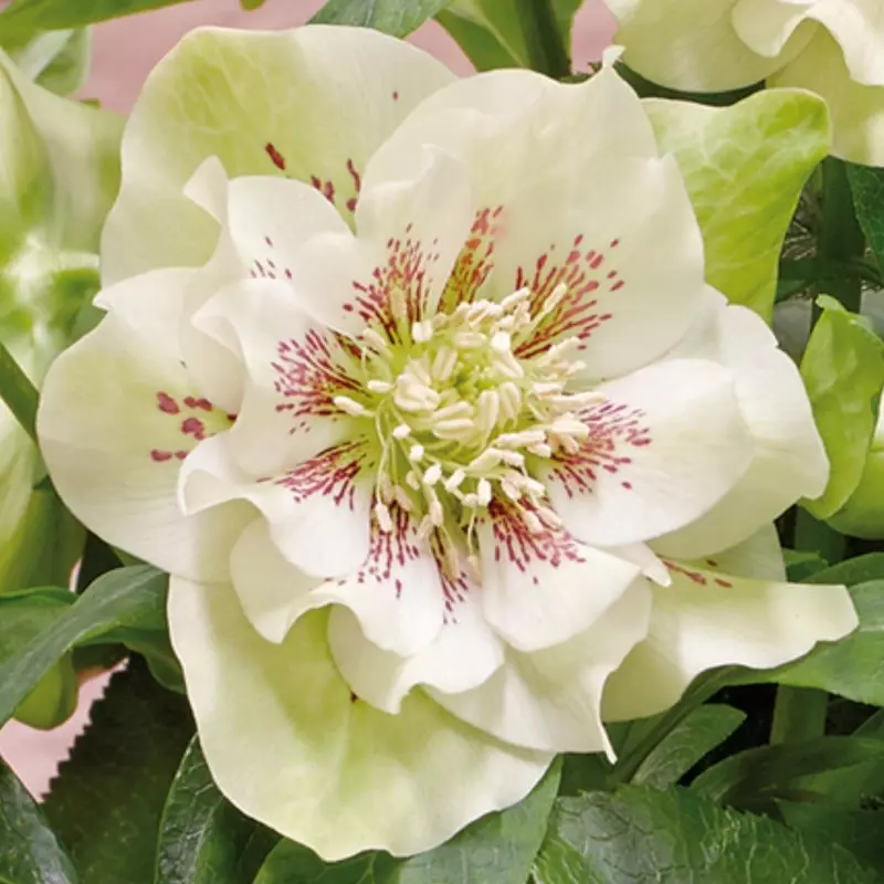 A bashful little bloom, the faces of Helleborus ‘Orientalis White Spotted’ point modestly towards the ground. Gently lift the flowers up to reveal their astonishing, intricate beauty –double, frilled layers of alabaster petals are delicately stippled with burgundy freckles.