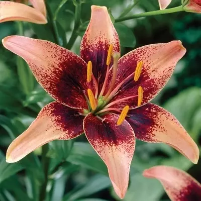 Salmon-pink blooms with purple-spotted centres make Asiatic Lily 'Whistler' a delightful addition to borders. Every flower offers a soft blend of colour, to enhance your garden with a sensitive charm. Recommended for fashioning a gentle, harmonious presence in your sunshine garden.
