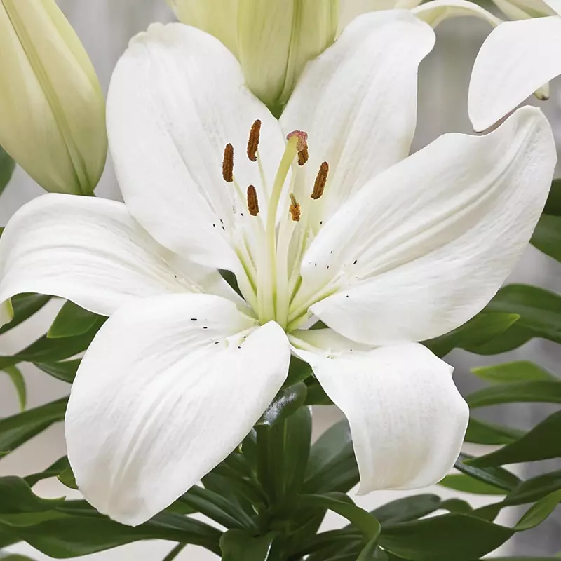 The lustrous white blooms of Asiatic Lily ‘Gwen’ will gleam like precious pearls in your garden. Generous, broad blooms are held on short, sturdy stems which are densely covered with glossy leaves.