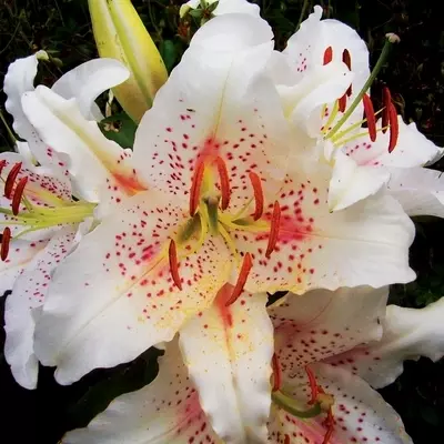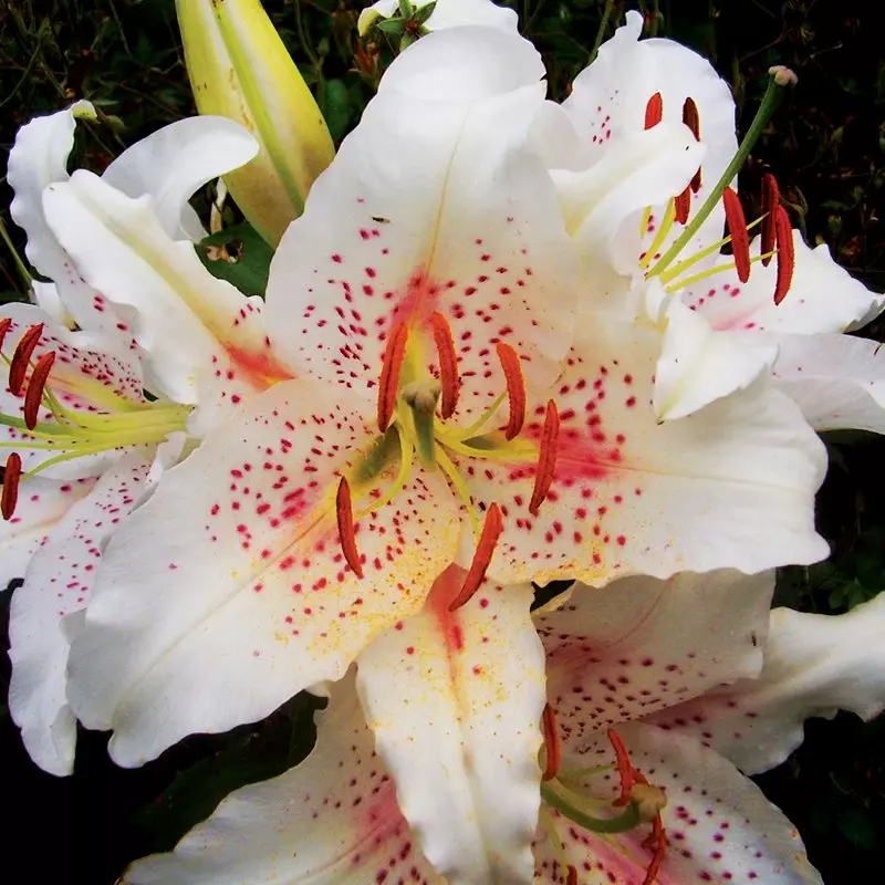 The pristine blooms of Oriental Lily ‘Muscadet’ resemble the delicate beauty of a porcelain doll. Pearly, translucent white petals are tinted by a demure pink blush and maroon freckles.