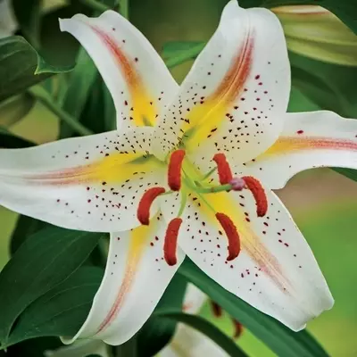 Perfect for cutting, the glorious blooms of oriental lilium 'Garden Party' are white in colour, with a gold band blushing to pink as it tapers down the centre of each petal. Burgundy freckles speckle the petal surfaces and enhance Garden Party’s tropical looks along with dusty rust-orange stamens.