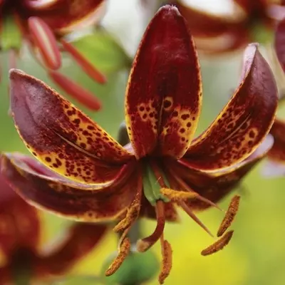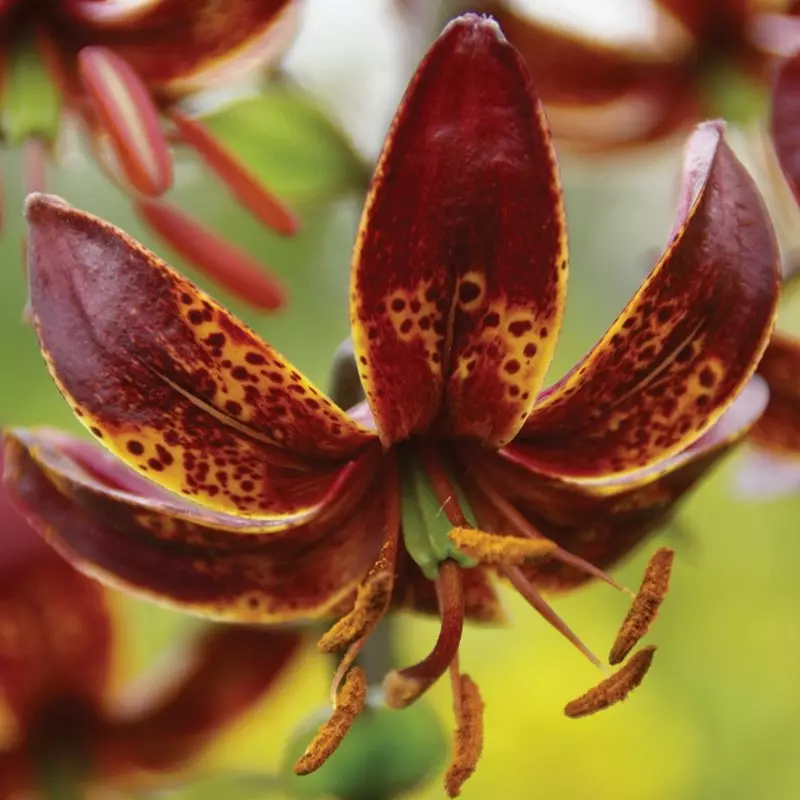 Downward-facing, mahogany red to claret purple flowers are peppered with yellow-orange speckles on the enchanting Martagon Lily ‘Claude Shride’. The flowers bloom, up to 30 per stem, during June and July each year.