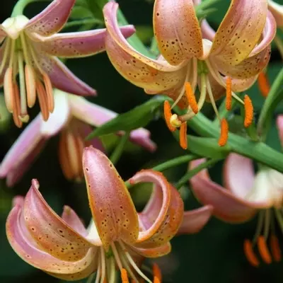 Graceful, nodding blend of pink, peach-orange blooms freckled with cinnamon spots appear above whorled leaves. Martagon Lily 'Fairy Morning' is an eye-catching Turks Cap Lily reaching 120 cm tall is a captivating choice for the garden borders.