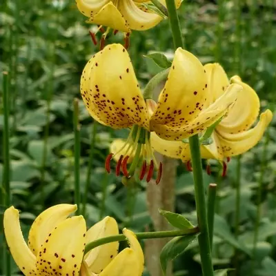Golden petals studded with dark red freckles twist backward on arching stems. Martagon Lily 'Golden Morning' is delight in a summer garden. The 'morning' theme of these lilies is reminiscent of early morning light colour.