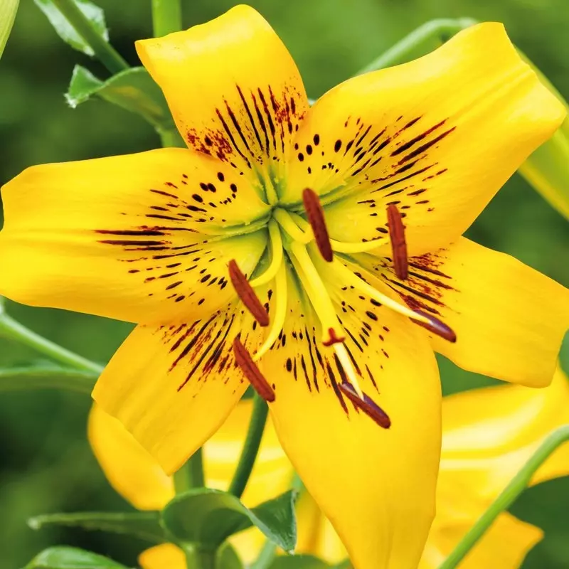 Buttercup yellow blooms adorned with maroon-red strokes at the centre bring Tiger Lily 'Yellow Bruse' vibrant personality. These dynamic flowers brighten summer gardens, offering a lively contrast to greenery.