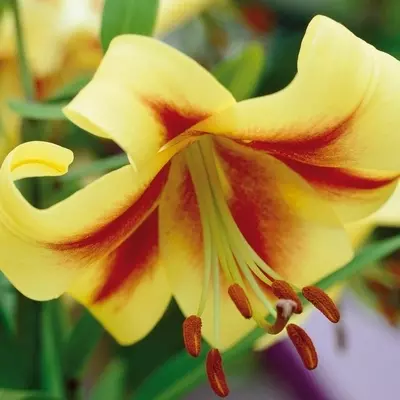 Immediately striking, the enormous, bold blooms of Oriental Trumpet Lily ‘Robert Swanson’ will bring fiery flair to your borders from July to August. Golden yellow petals feature a flame of bronzed crimson, with contrasting lime green stigma radiating a delicate fragrance.