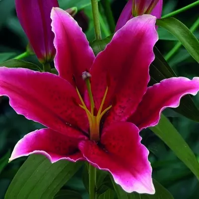 Oriental Lily 'Chartwell' is a strong and steady-growing lily that captivates with its seductive blooms. Each flower showcases rich burgundy-red with a paler edge fading to silky white, creating a dramatic, eye-catching contrast against the plant’s dark green foliage
