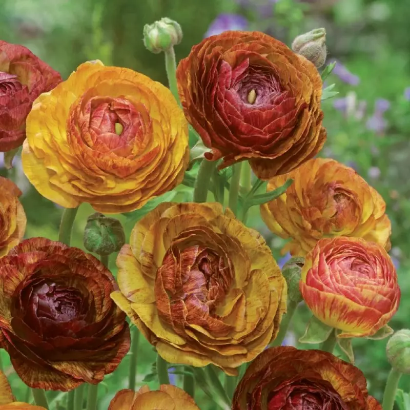 Ranunculus 'Picotee Cafe' fascinates with delicate blooms in shades of orange, red, and pink. Each petal appears intricately painted, offering a mosaic of hues which dance in the sunlight.