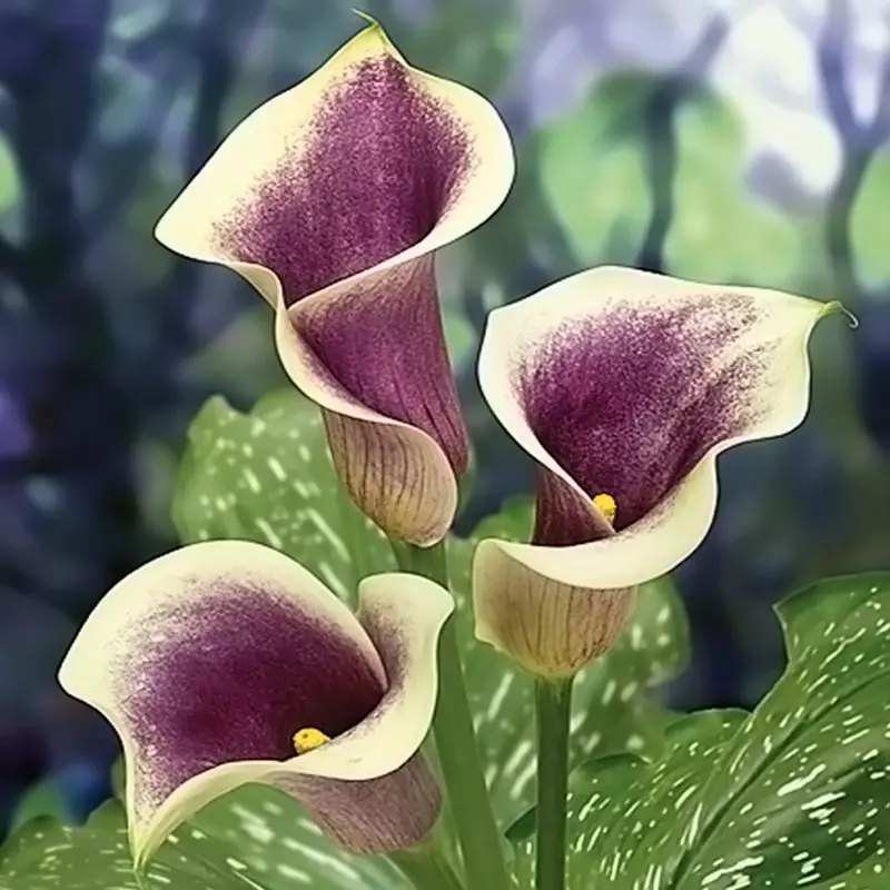 A masterpiece of dramatic, bicolour blooms, Zantedeschia ‘Picasso’ is the magnum opus of Calla Lilies. This artistic variety sports spathes of velvety, aubergine purple framed by a cream rim, each encompassing a central golden spadix.