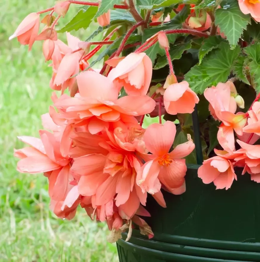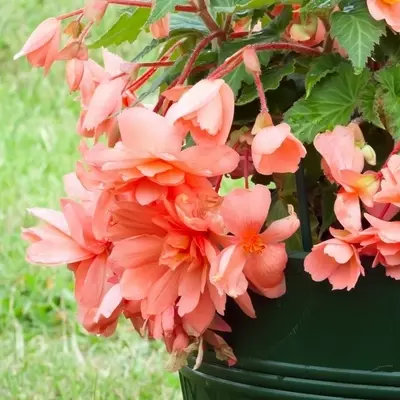Pendula Cascade 'Salmon' Begonias are excellent for adding beautiful warm colour to your summer displays. Soft salmon-orange double frilly blooms can reach up to 15 cm in diameter and cascade over containers. Our begonias flower for months on end, from May until at least September.