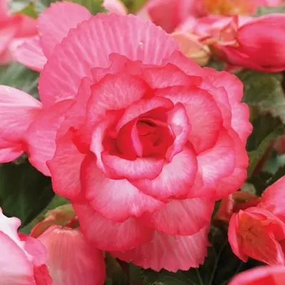 Begonia 'Florence' is wonderful for adding beautiful shades of colour to your summer displays. Double frilled rosy-pink and white blooms that can reach up to 7 cm in diameter with dark green serrated foliage. Our begonias flower for months on end, from May until at least September.