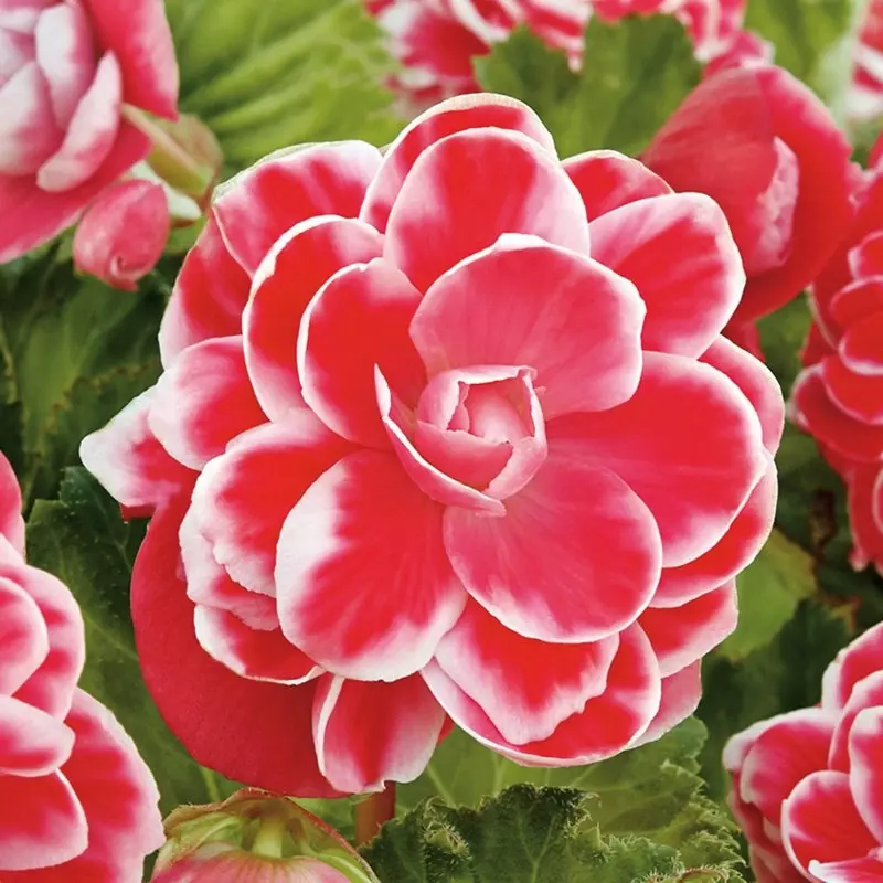 Begonia 'Crispa Marginata White' is wonderful for adding long-last elegance and interest to summer planting. Pure white flowers with a wavy red edge, and blooms that can reach up to 10 cm in diameter with dark green foliage. Our begonias flower for months on end, from May until at least September.