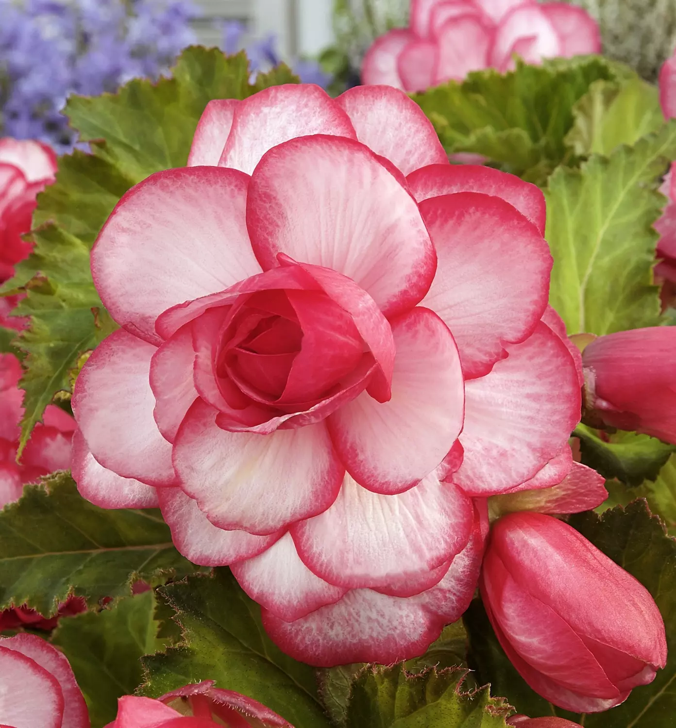 Begonia 'Bouton de Rose' is unusual and beautiful, with large double flowers that resemble rosebuds. Pale pink centre and a dark pink-red edge, with a spread of 20 cm when mature. Our begonias flower for months on end, from May until at least September.