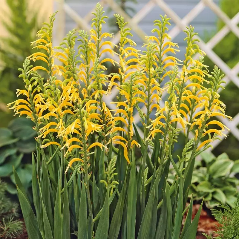 Pleasing little buds emerge in neat rows, before bursting open into tubular flowers of canary yellow. Beside the spires of blooms, blades of iris-like, lime-green foliage stand bolt upright, striking a handsome silhouette. Native to South Africa, Chasmanthe Floribunda ‘Ducktii’ are particularly well-suited to being grown in pots which can easily be brought under cover over winter.