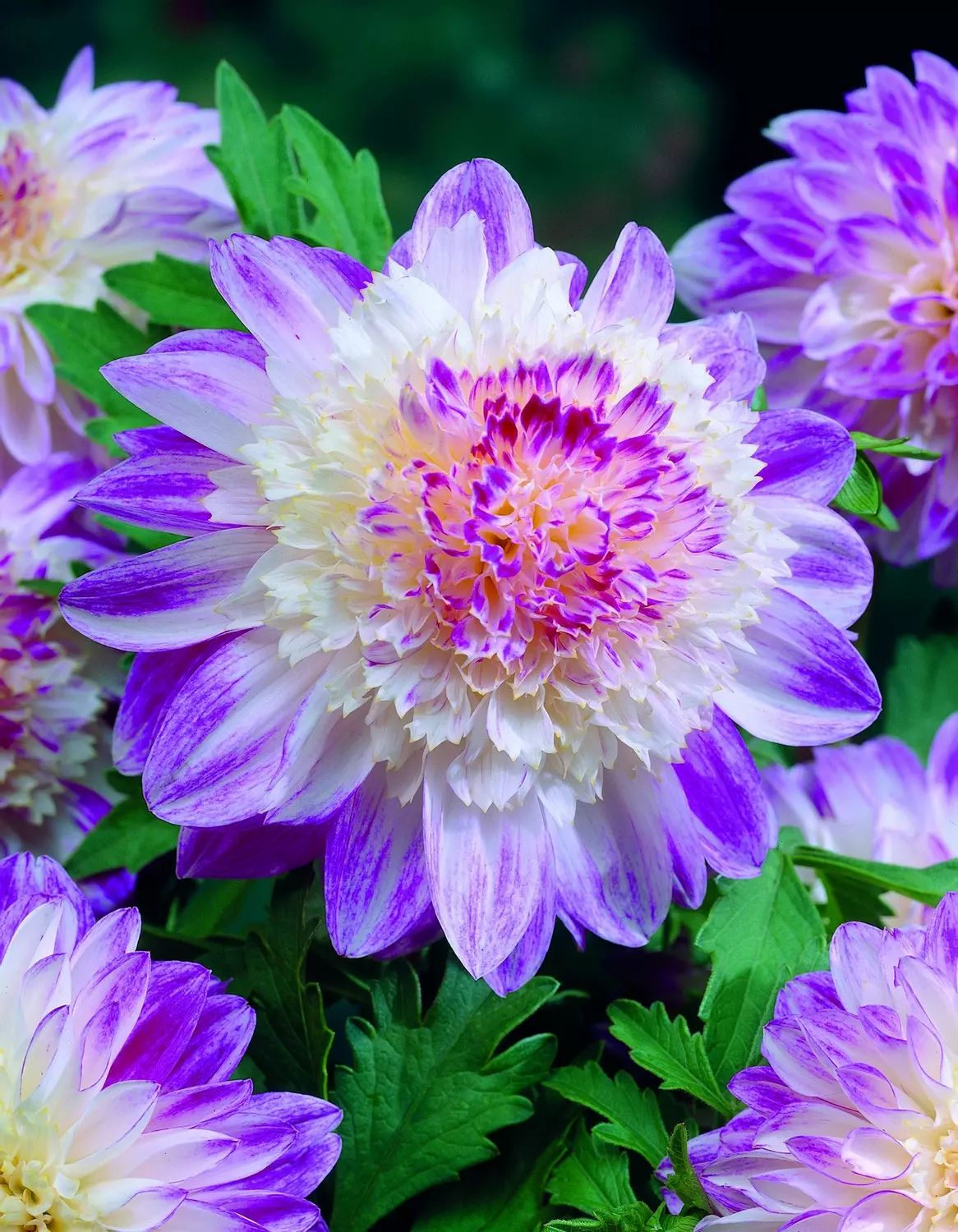 This gorgeous anemone-flowering dahlia 'Que Sera' sports large, white double blooms with contrasting lilac and blackberry markings. Very beautiful when planted and arranged with black scabious, plum foliage and textural grasses for a long-lasting display.