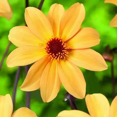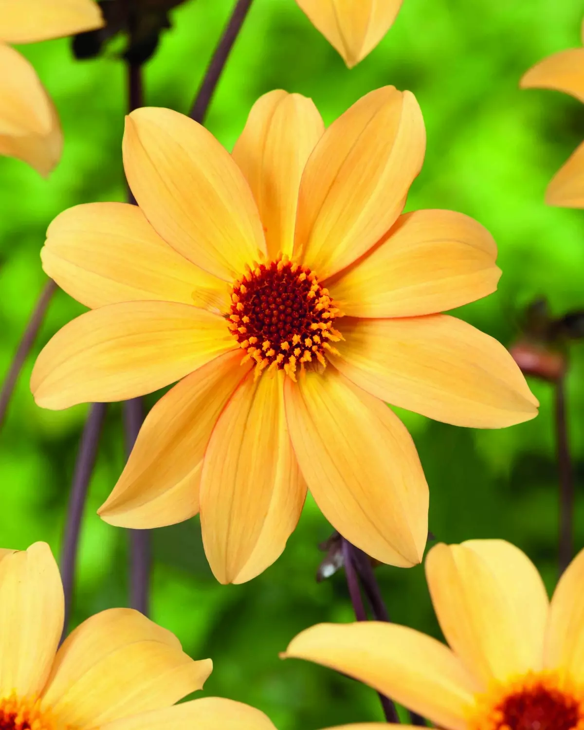 Dahlia ‘Bishop of York’ produces a healthy bed of lush, deep-purple almost black foliage, studded with sunny golden yellow blooms for numerous months from July and grows to a mature height of 90 cm.