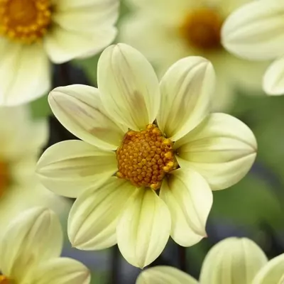 Single Flowered Dahlia 'Happy Days Lemon' grows to a height of 40 cm tall and is great for pots and for planting in front of the border.