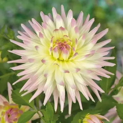 Capturing the bright effervescence of its namesake, Semi-Cactus Dahlia ‘Shooting Star’ captivates with luminous, pale-yellow blooms, laced with lilac tips, shimmering with the opalescent beauty of a moonstone. Layers of quilled petals radiate outwards like a many-pointed star.