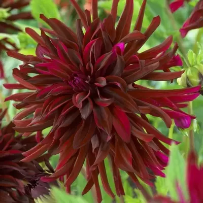 The blooms of Cactus Dahlia 'Black Narcissus' exudes mysterious elegance with its deep, almost-black maroon blooms and a hint of pink at the centre. Distinctive spidery, deeply quilled petals give them a unique star shape.