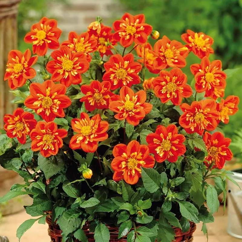 Dahlia ‘Alstergrusse’ is a dwarf collarette dahlia, bearing masses of pretty citrus-orange cartwheels. The vibrant, open-faced blooms smother neat foliage from July to October, shining out against a dark-green backdrop. Delightful in a tropical colour scheme with coral-reds and rich yellow tones.