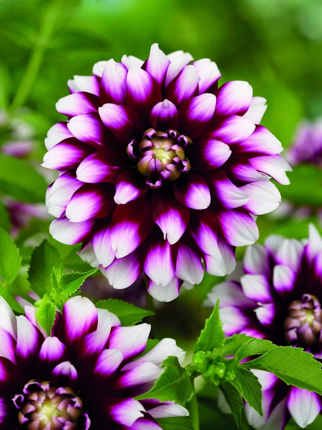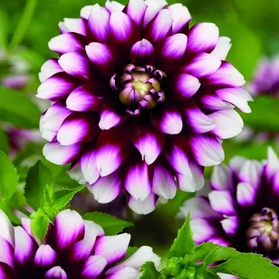 Deep purple petals outlined with crisp white create a refined contrast, making Dahlia 'Verdi' ideal for containers and pots. This elegant blend of colours enhances small garden spaces without overpowering other plants.