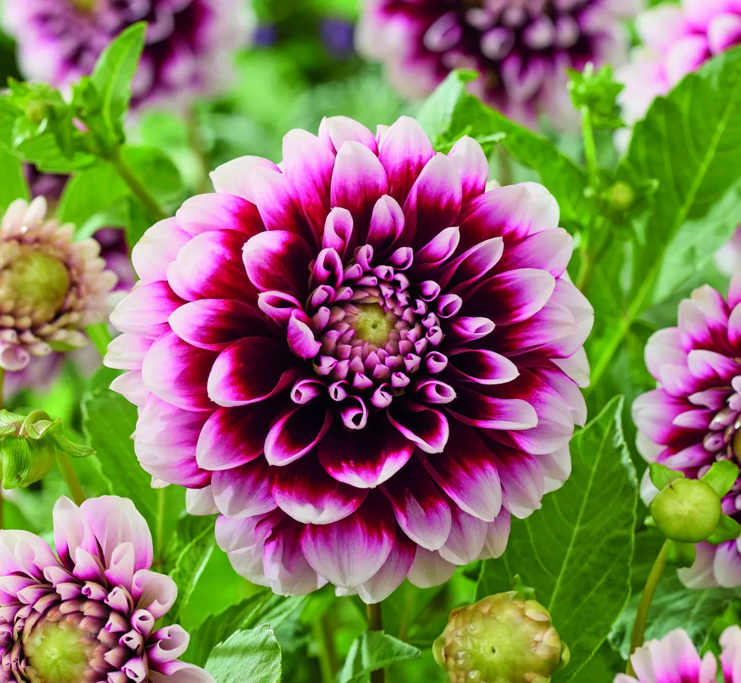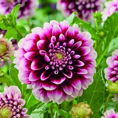 Decorative Dahlia 'Edinburgh' is striking with crimson-purple flowers tipped in white creating a stunning two-tone effect. A wonderful description would be the blooms resemble rich velvet draped in snow.