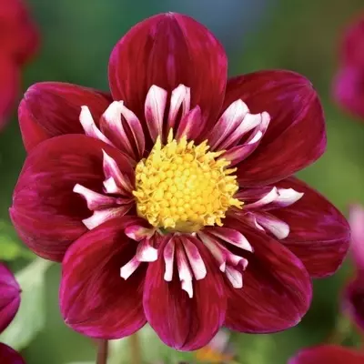 This luxurious antique purple red dahlia features a smaller ring of white-tipped petals circling the nectar-rich heart. Pollinator-friendly collarette and single-flowered dahlia 'Fantastico' is a wonderful addition to any garden and will reward you with a long season of blooms. Perfect for containers thanks to their compact habit and height of 50 cm.