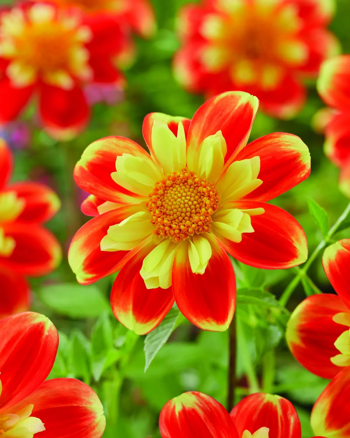 The second in our 'Swan Island' dahlia collection, bright and delightfully spirited, Collarette 'Pooh Swan Island' Dahlia bursts into the garden like the glowing sun.