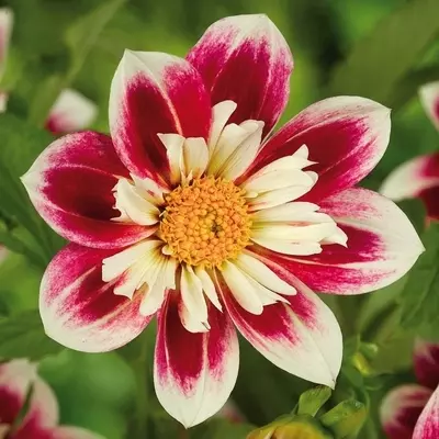 Collarette Dahlia 'Fashion Monger' arrives in the garden like a tiny diva dressed for the spotlight. Its creamy white outer petals flare outwards, each one dipped in raspberry-red with an elegant ring of smaller, frilled petals matching in colour. Standing tall at 80 cm.