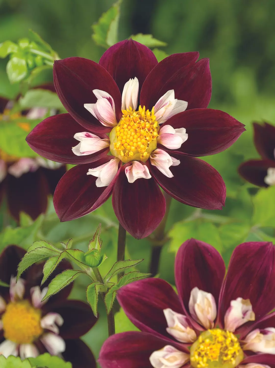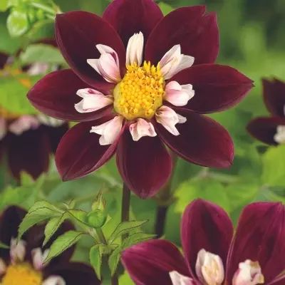 Collarette Dahlia 'Mary Evelyn' creates a visual dramatic flair to the garden, with deep dark red petals surround a ring of shorter white florets, creating a refined collar effect which enhances visual appeal.