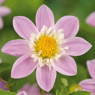 Two sets of petals form the exquisite blooms - an outer larger set in a romantic shade of soft lilac-pink and a smaller, inner ruffle of pure white petals surrounding the yellow centre. The collarette dahlia 'Famosa' flowers are adored by bees, butterflies, and other garden pollinators as they are a rich source of nectar.