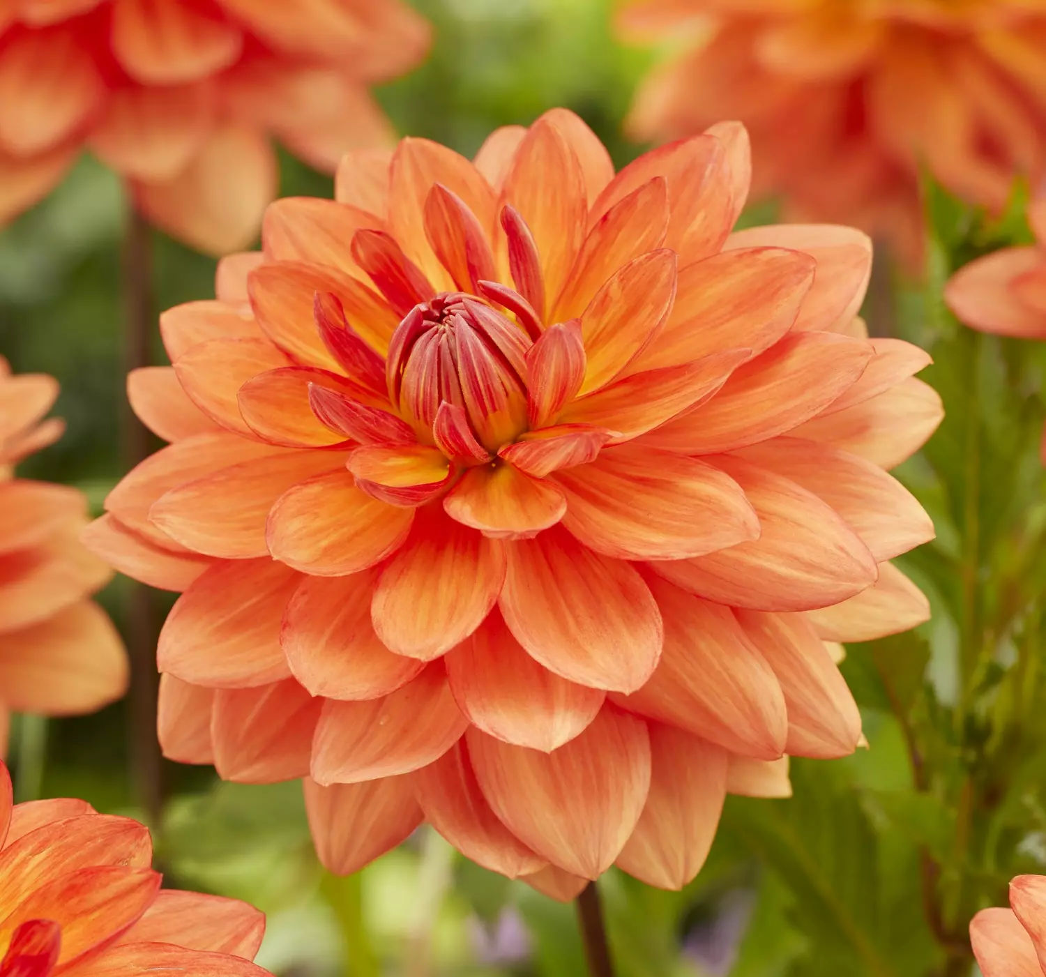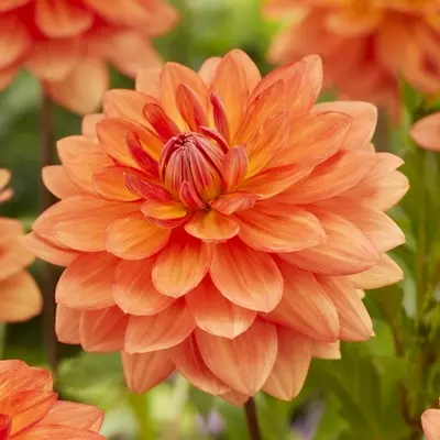 Radiating warmth, Waterlily Dahlia 'Shep's Memory' adds a uplifting charm to garden borders, growing to a height of 110 cm. Petals of soft orange-peach curve inwards to form a graceful, symmetrical bloom.