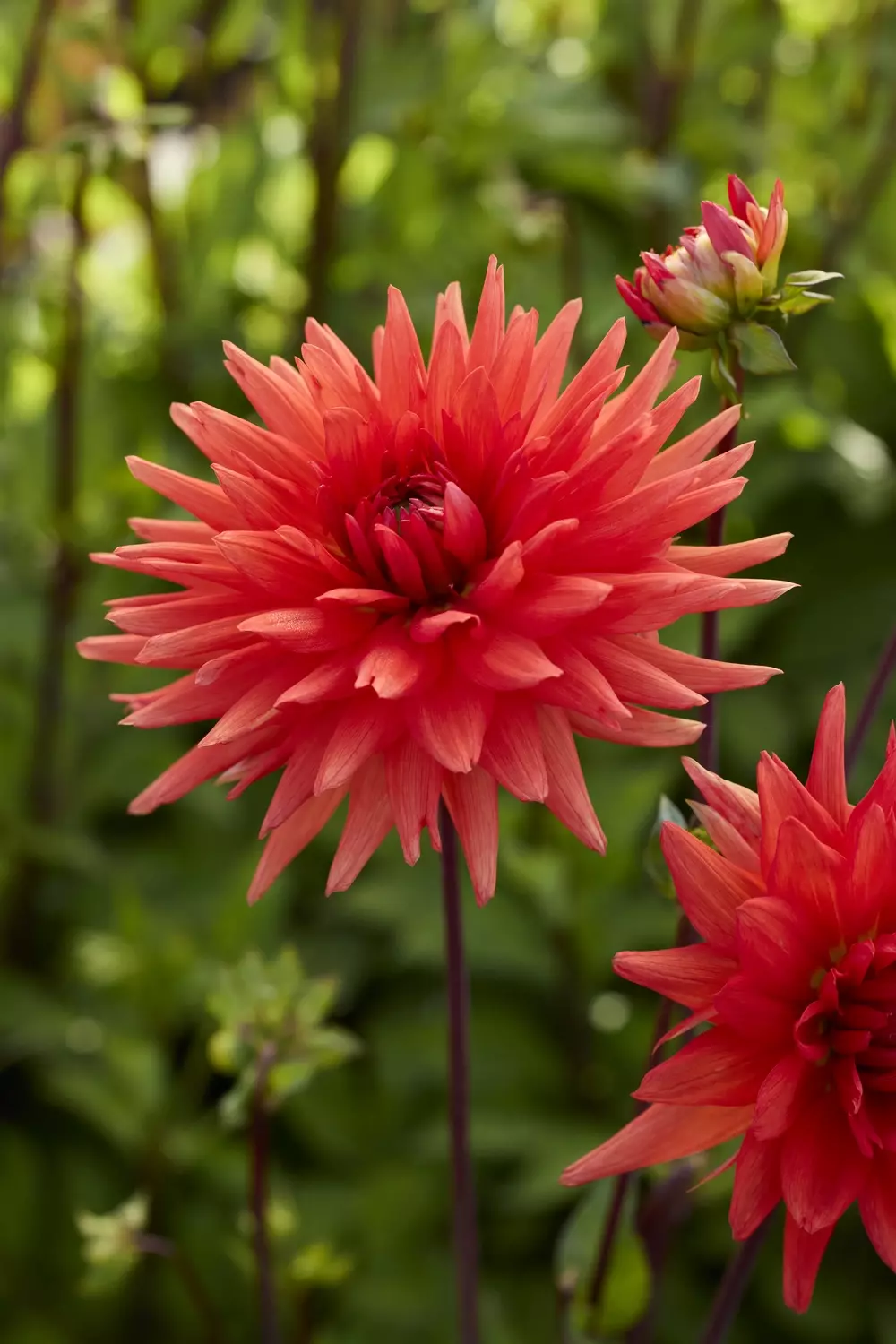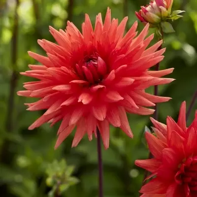 Cactus Dahlia 'Park Idylle' commands attention with its dramatic spiky blooms, that radiate like warm sunbursts across the garden. Each flower opens in vibrant orange-red, a glorious beauty.