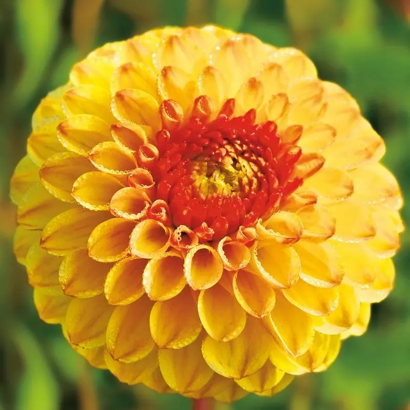 Golden petals blend seamlessly into a vibrant red centre, producing a warm and inviting bloom. Ball Dahlia 'Sunny Boy' appearance is like a glowing ember nestled inside a golden lantern.